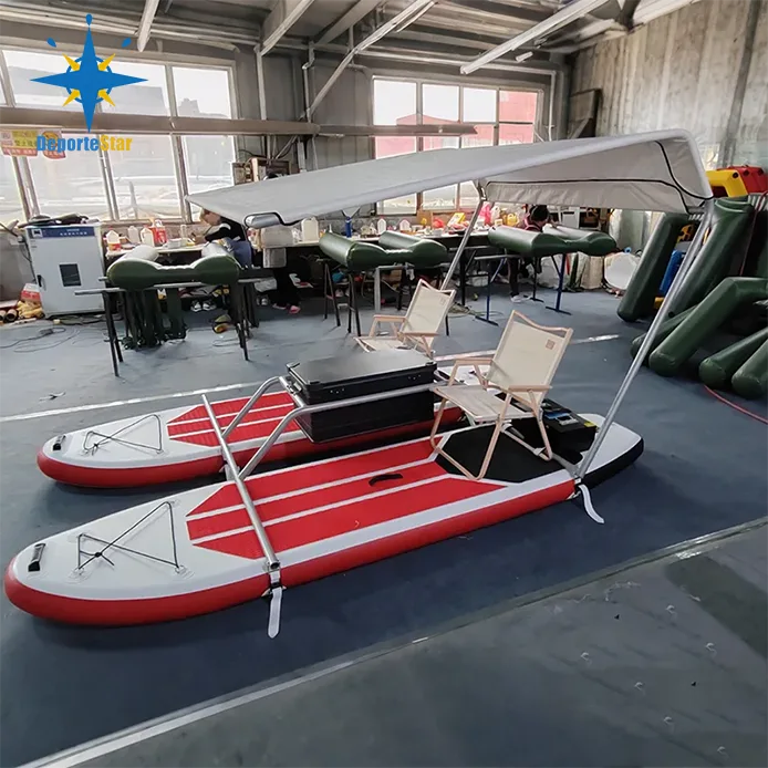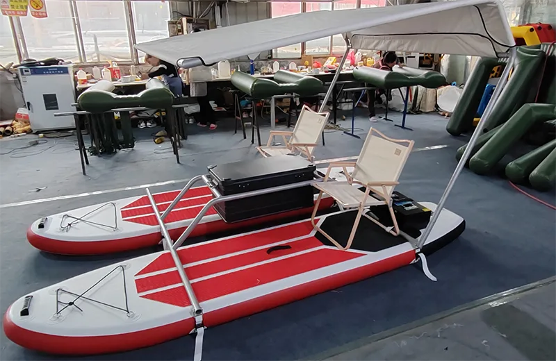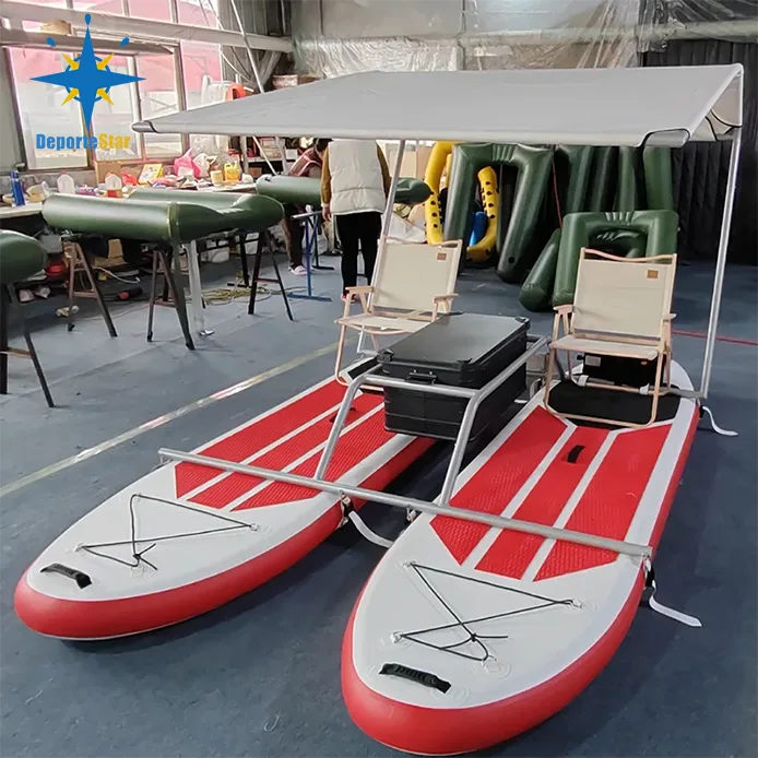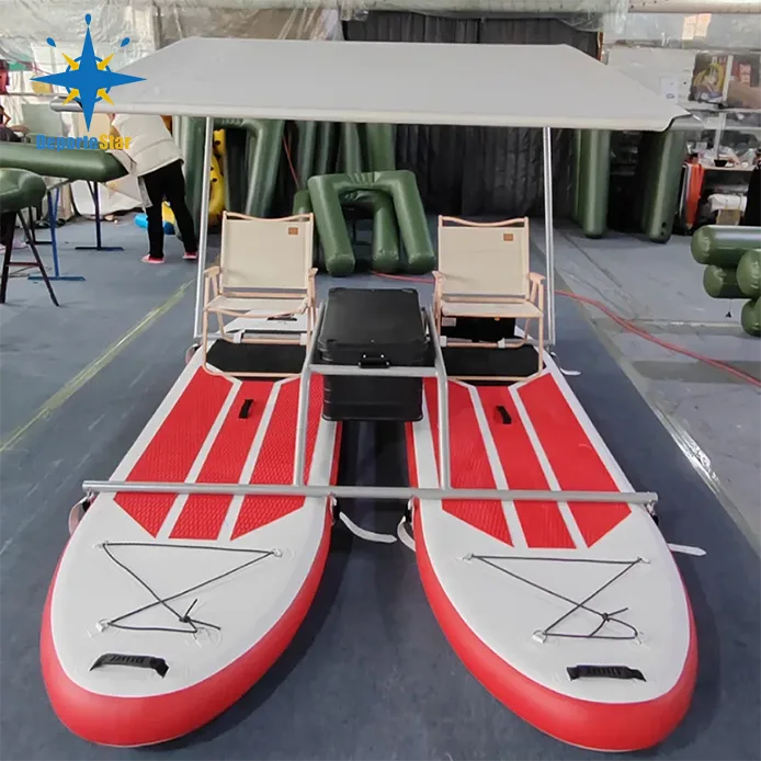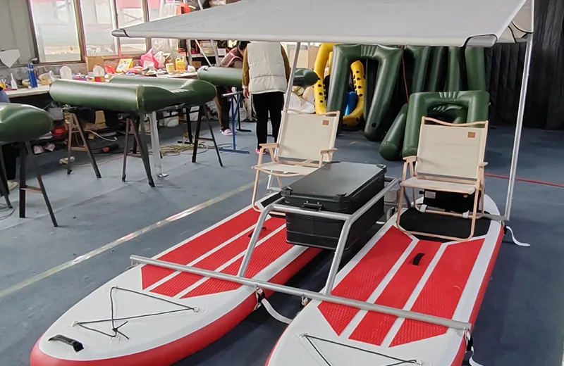 1. Reka Bentuk Unik: - Bahan ringan PVC Tube (Pad Wire) Surfboard dengan bingkai aluminium atau bingkai keluli stalinless. Yang memandu kestabilan dan kebolehlaksanaan ke atas air. Catamaran kembung ini dapat diselaraskan bentuk mengurangkan rintangan air.